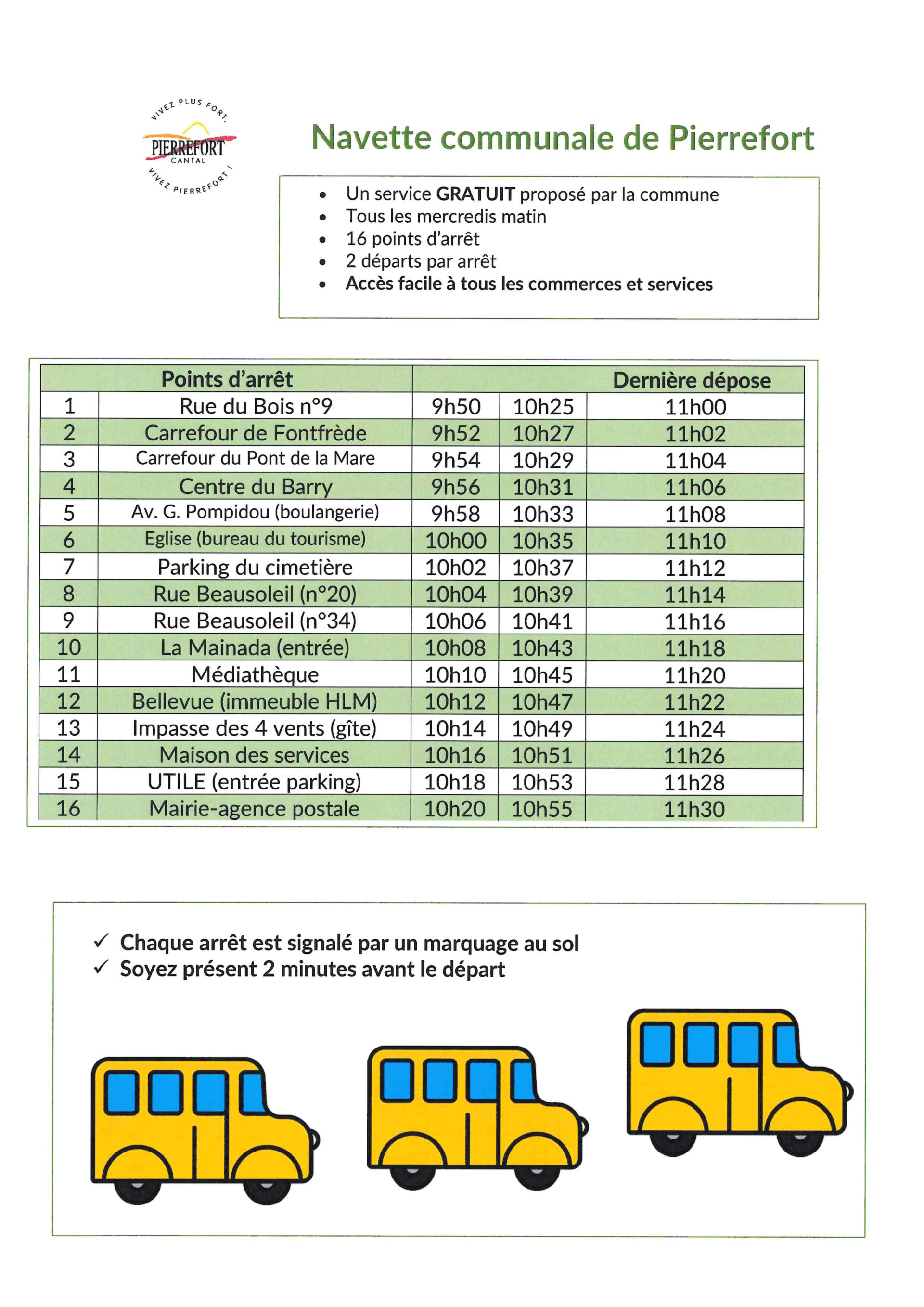 Depuis décembre 2020, dans un souci d'accessibilité des commerces et services à tous les habitants de la commune, la municipalité de Pierrefort propose un service GRATUIT de navette.